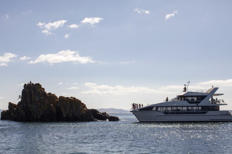 Your festivities begin aboard our 23m catamaran, Peppermint Bay II. Departing from Hobart, your guests will cruise in quiet comfort down the D’Entrecasteaux Channel, passing iconic scenery along the way, including the famous Alum Cliffs, which are mirrored in our building’s striking architecture. Our catamaran can accommodate up to 160 guests, with drinks served on board from our bar.